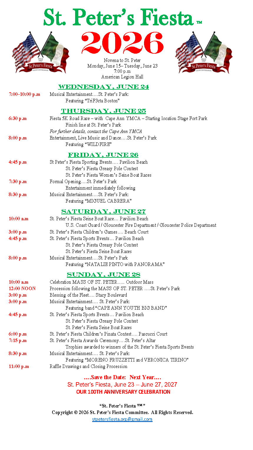 The St. Peter's Fiesta is an annual celebration in Gloucester, MA taking place on the weekend closest to the Feast Day of St. Peter, June 29. The St. Peter's Fiesta is an event sponcered by Gloucesters Italian-American fishing community that started in 1927.